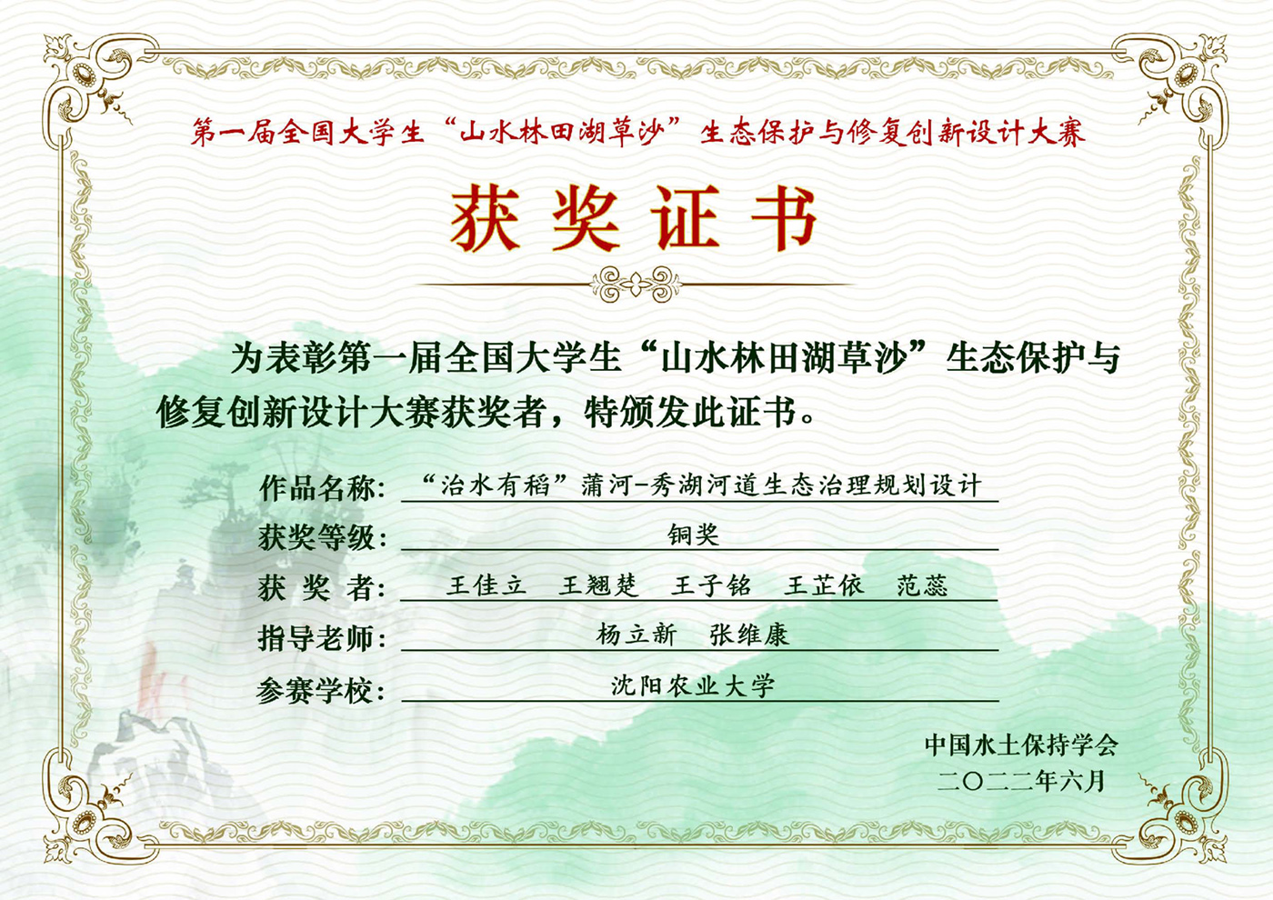 近日,在首届全国大学生“山水林田湖草沙”生态保护与修复创新设计大赛决赛中,华体会(中国)风景园林学科教师杨立新、张维康指导研究生王佳立、王翘楚、王子铭、王芷依、范蕊完成的作品斩获铜奖。