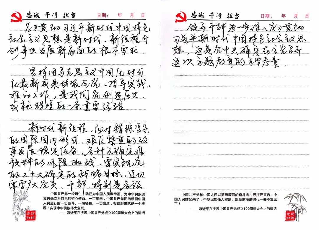 从党的十九大到党的二十大,是“两个一百年”奋斗目标的历史交汇期,是我党团结带领全国人民群众砥砺奋进、奋勇前行的五年。我将不断学深悟透党的二十大报告精神,努力提高本领,消除“本领恐慌”和“知识短板”,在本职岗位上兢兢业业,努力钻研,开拓创新。