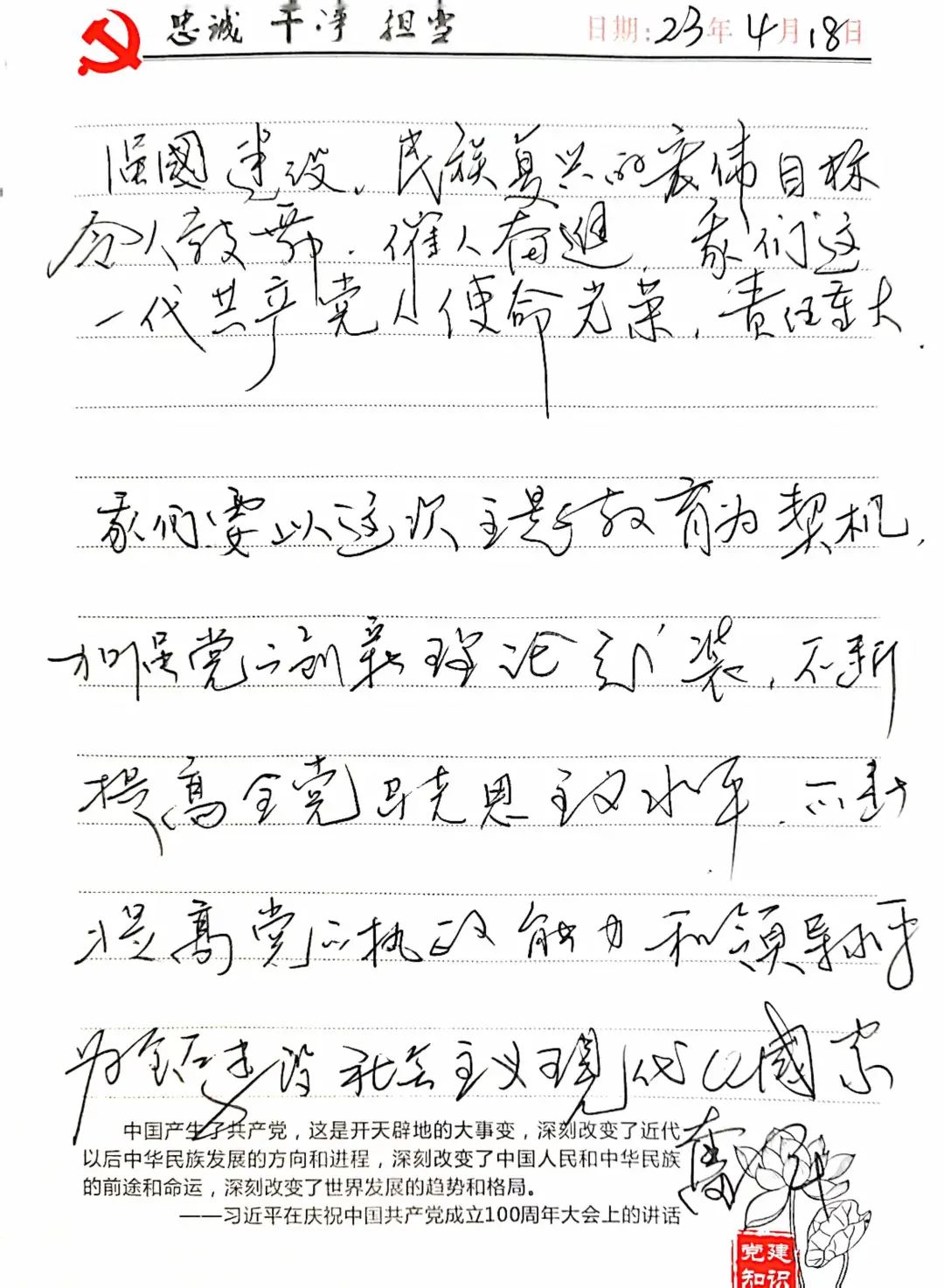 常修常炼是时代要求,坚定信念是终身课题。作为共产党员,初心使命要信一辈子、守一辈子;作为一名基层党务工作者,更要与时俱进学习、持之以恒学习。当代青年生逢其时,我们要丰富知识、拓宽眼界、提高能力,才能展现作为,担负起时代使命。