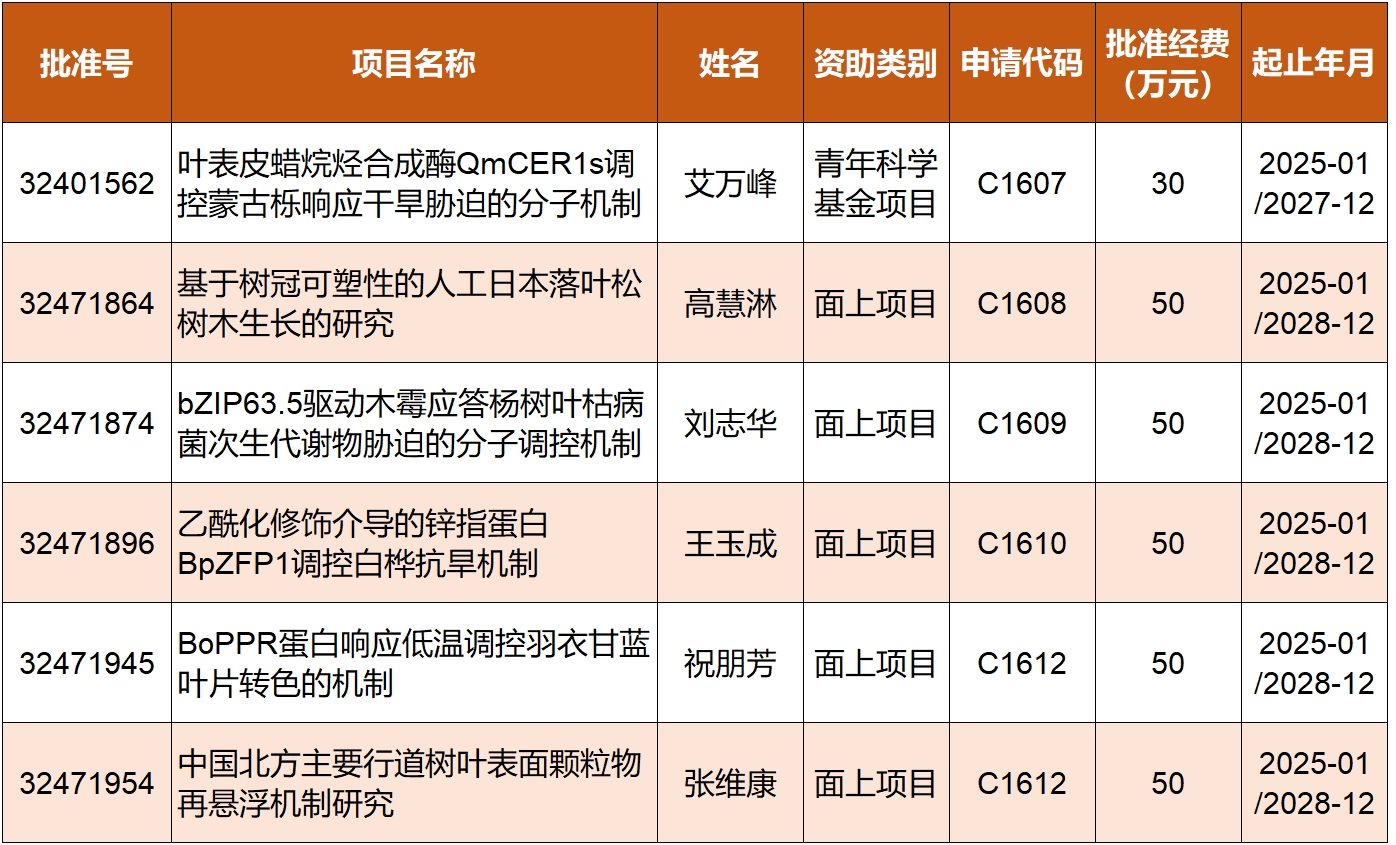 华体会(中国)55.6%专业教师主持申报2024年国家自然科学基金项目35项(面上28项+青年7项),申报项目数比去年增长84.2%。获资助6项,总体获资助率17.1%,面上项目获资助率17.9%,青年科学基金项目获资助率14.3%。林学学科教师申报25项,获资助4项,资助率16.0%。风景园林学科教师申报9项,获资助2项,资助率22.2%。