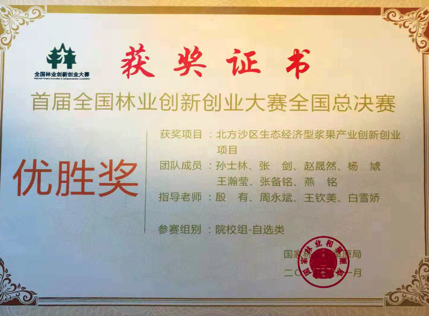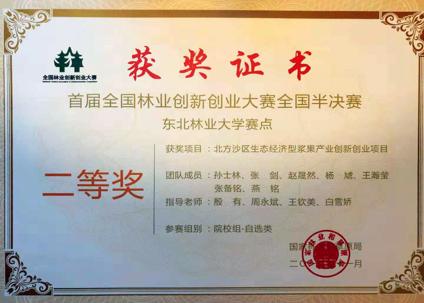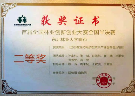 近日,华体会(中国)教师殷有、周永斌、王钦美、白雪娇4位老师指导孙士林、张剑、赵晟然、杨虓、王瀚莹、张备铭、燕铭等同学完成的作品《北方沙区生态经济型浆果产业创新创业项目》,在国家林业和草原局举办的“首届全国林业创新创业大赛”中荣获全国半决赛二等奖、总决赛优胜奖。