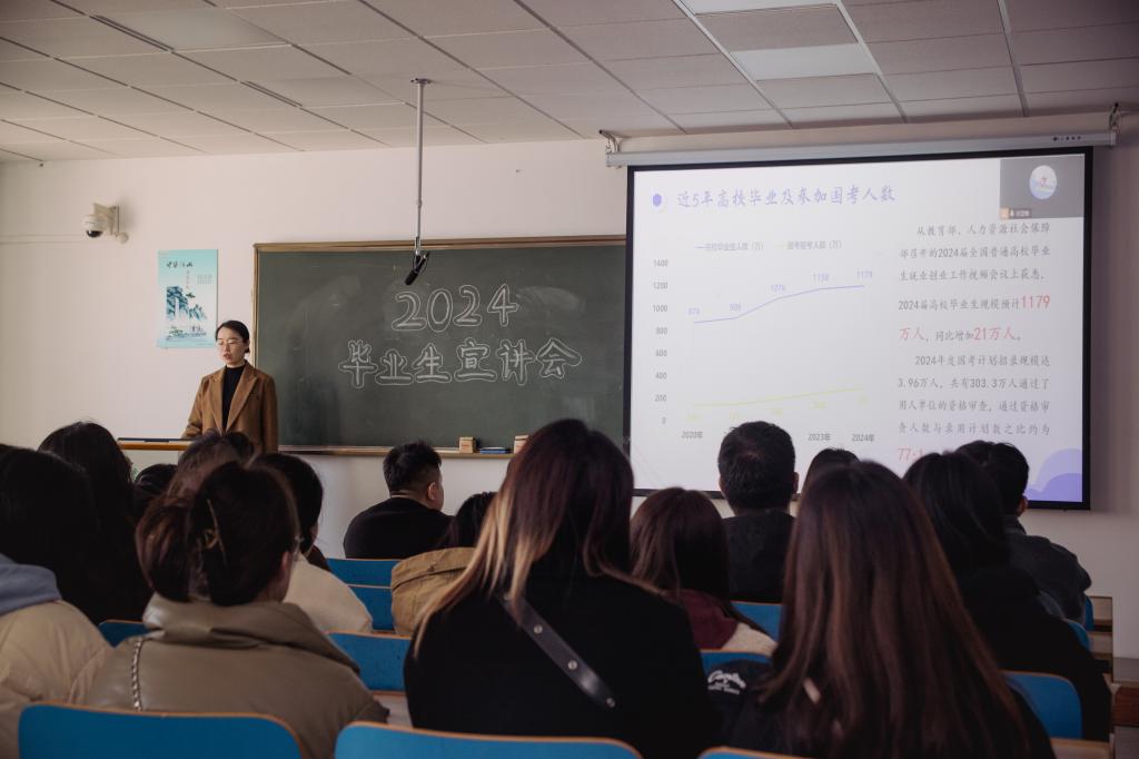 任亚敏老师结合近5年各专业就业现状及就业去向等基本情况详细介绍了当前就业形势,为2024届毕业生进行就业分析研判和思想动员,号召同学们把握机遇,积极就业。赵梓皓结合自身就业经历,鼓励同学们树立“先就业再择业,边就业边择业”的就业意识,从实际出发选择职业和工作岗位,把握机遇,为进入新的人生阶段做好准备。常钰详细介绍了她目前工作现状,希望同学们在求职过程中勇于应聘尝试,敢于主动出击,放眼未来发展,择善行而从之。李亚亚和童郁强也通过资料分享的形式对选择考公考编和企业工作的同学分别给出了指导建议,希望同学们能发挥专业所长,在多领域高质量充分就业。