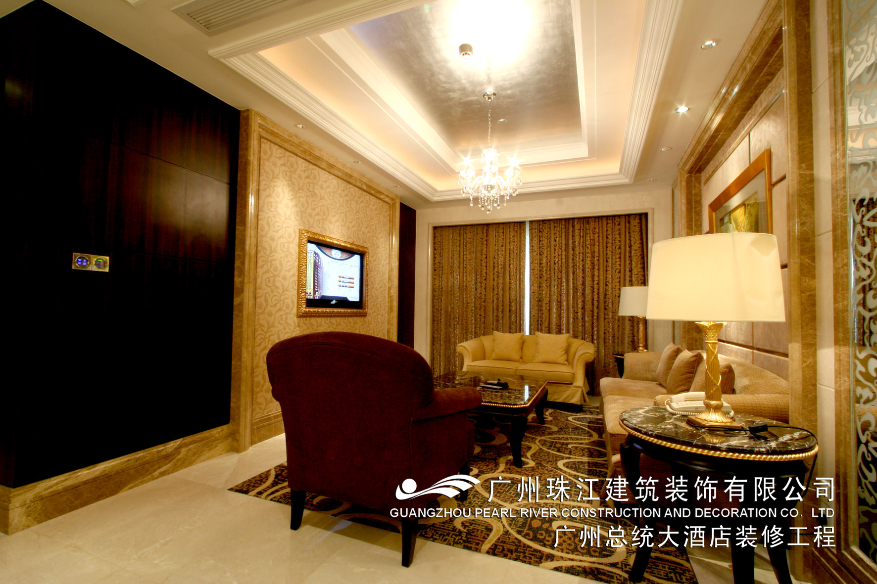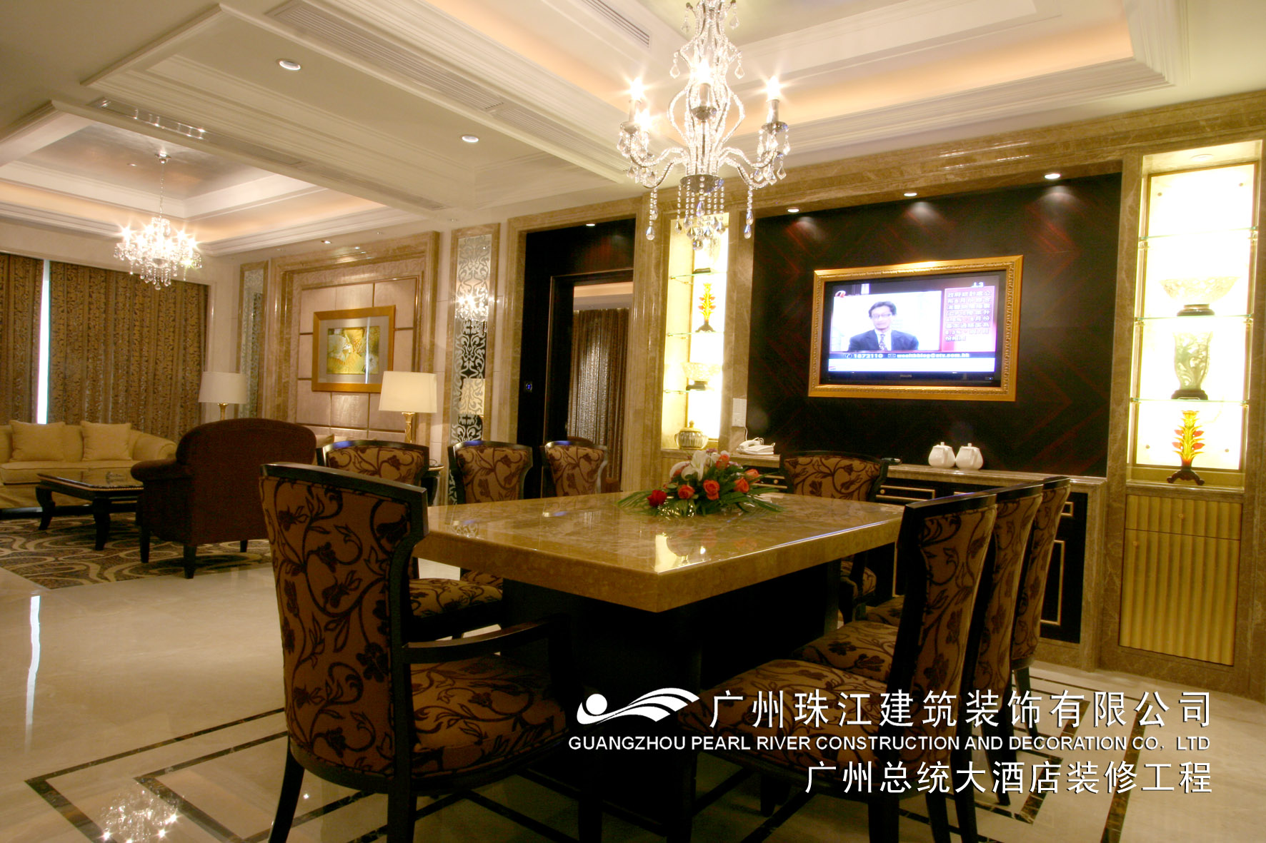 开业于一九九五年的总统大酒店是由广州海印实业集团有限公司精心策划的四星级涉外商务酒店。位于广州市天河区商业繁华地带。拥有全新装修的各类高级客房215间;可供大约1000人用餐的中、西式餐厅;配备可容纳600人以上的国际会议中心,会议厅的无柱式设计气派非凡及专业的会展设施、先进的视听设备,适合举办婚宴、会议、商务展览、产品推介、公司庆典等各种规模的会展及宴会;酒店康体、娱乐设施齐备,设有健康中心、沐足阁等。